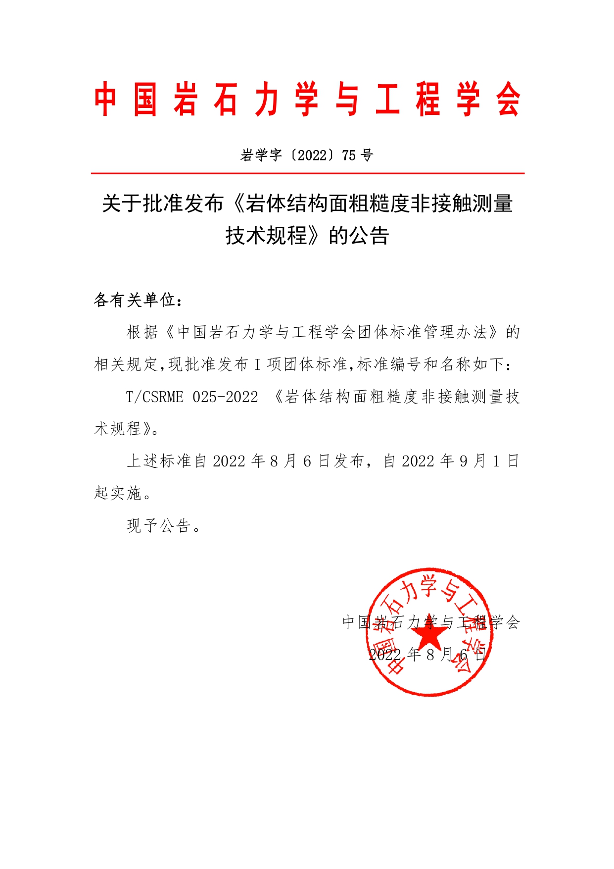 岩学字〔2022〕75号-关于批准发布《岩体结构面粗糙度非接触测量技术规程》的公告