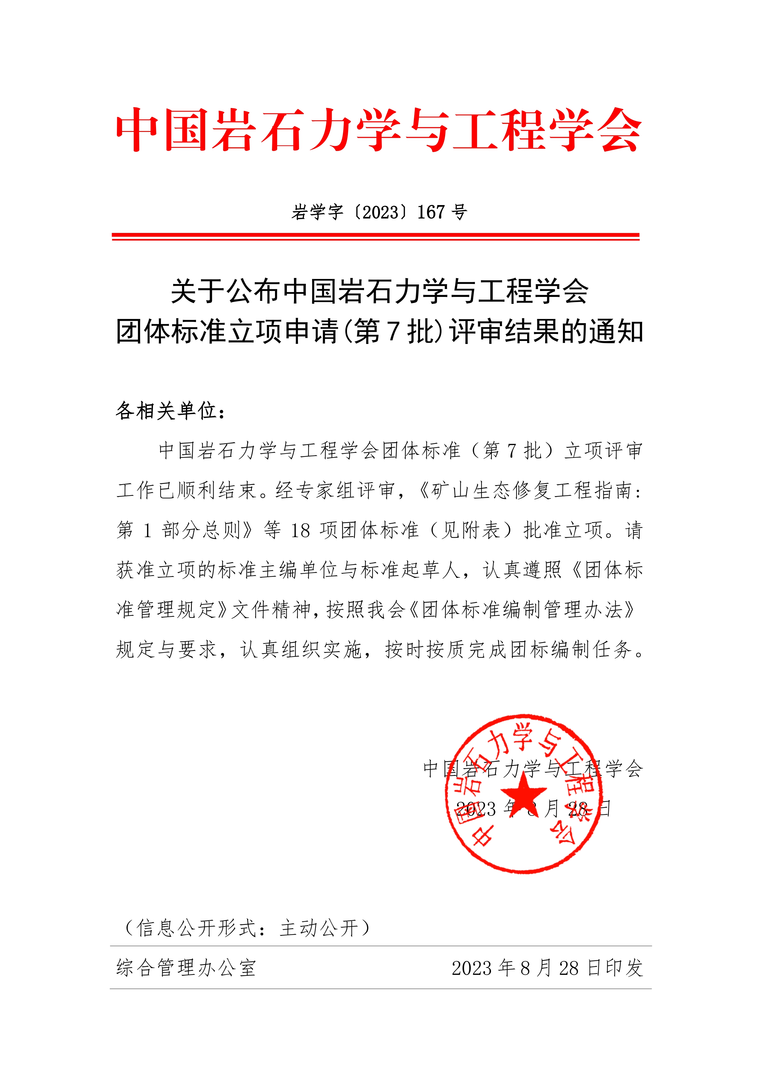 岩学字〔2023〕167号-关于公布中国岩石力学与工程学会团体标准立项申请第七批评审结果通知